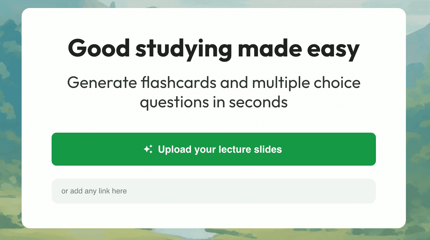 The core of any active recall practice is a cue + recall. Flashcards and practice tests do this through questions. The annoying part though is that the questions don’t just come out of thin air. Either you have to spend an hour combing through your notes or lecture slides to turn them into questions and flashcards, or you have to scour the internet looking for questions someone else made and hoping they align enough with your exact need.