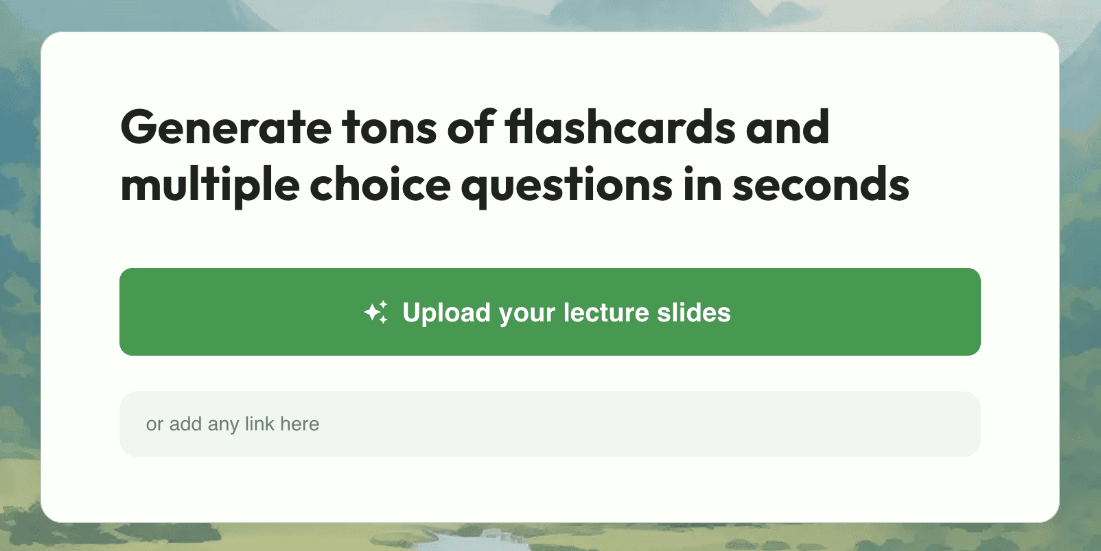 You can upload your lecture slides and get tons of high quality AI generated flashcards so you can spend less time making your flashcards, and more time actually studying them.