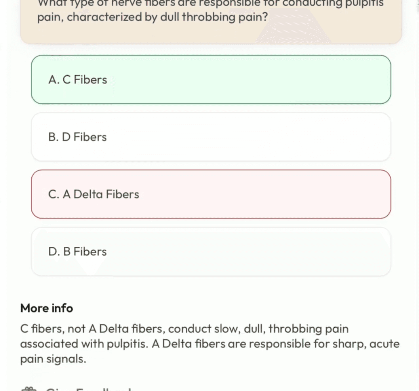 For multiple choice you get 4 answer choices and if you select any of the wrong answers, you'll get concise feedback telling why it's not that, but instead the other correct answer.
